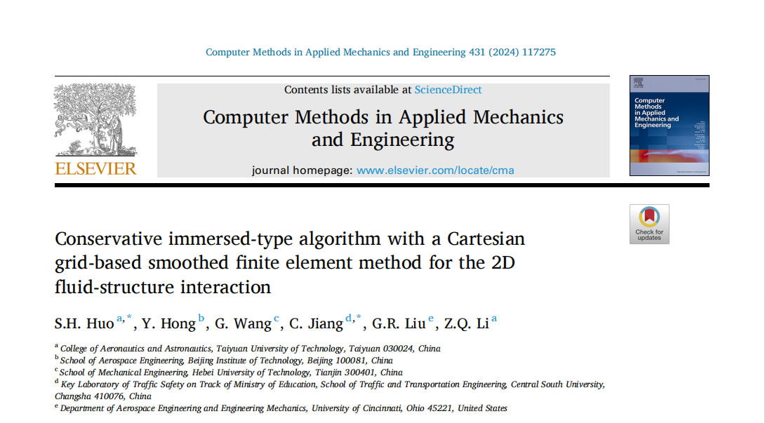 近日,我院李志强教授团队青年教师霍树浩在国际计算力学顶级期刊《Computer Methods in Applied Mechanics and Engineering》上发表研究论文。这篇论文的标题为“Conservative immersed-type algorithm with a Cartesian grid-based smoothed finite element method for the 2D fluid-structure interaction”,中文可译为“基于笛卡尔网格的二维流-固耦合守恒浸入光滑有限元法”。图1为论文首页,论文链接:https://doi.org/10.1016/j.cma.2024.117275。