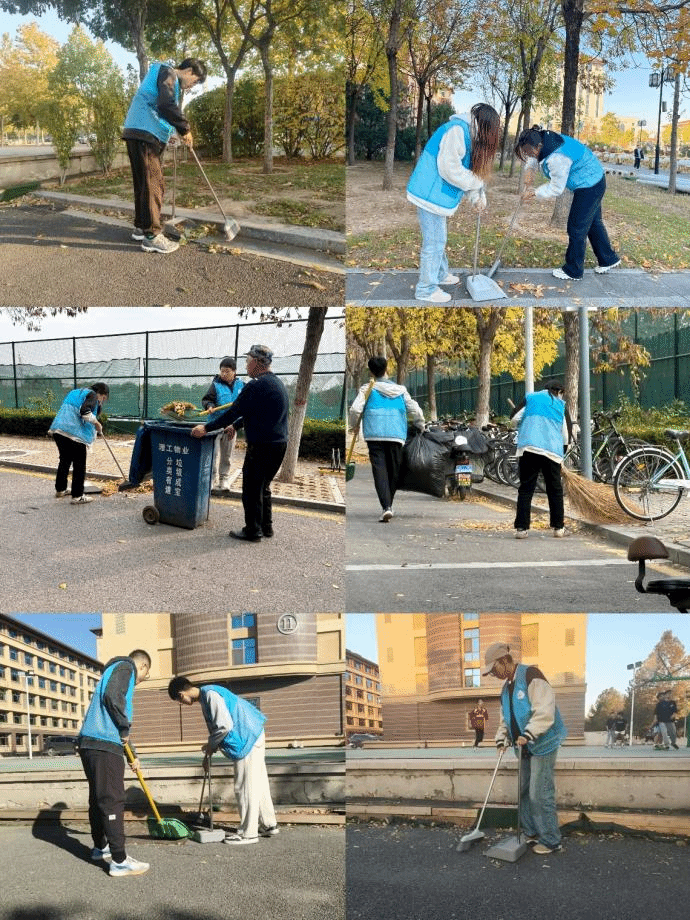 活动期间,志愿者们积极投入到从校园包干区域到宿舍公寓楼的劳动之中,锻炼劳动能力、体验劳动收获、培养劳动品质,将劳动落到实处。图书馆与行政楼之间的步道,东区网球场附近,西区篮球场的街道上,处处可见“航院蓝”的身影,形成校园里一道靓丽的风景线。同学们不顾秋日的寒意,手持各类清洁工具,认真仔细地打扫着道路两旁散落的树叶。同学们不仅深深体会到了后勤工作人员日常工作的辛苦与不易,同时也让学生们真切地感受到劳动所带来的充实和喜悦之情,领悟到了劳动所蕴含的价值和意义。
