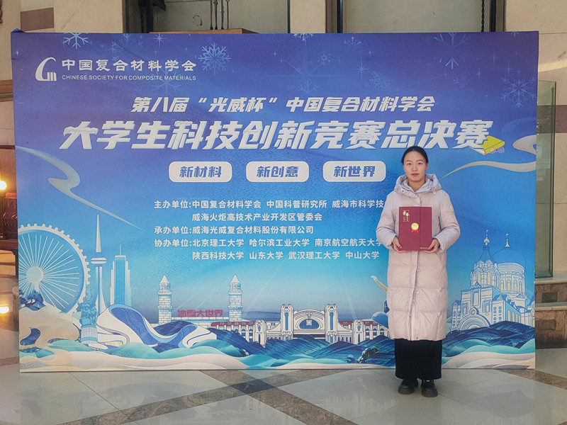 2025年1月3日-4日,第八届“光威杯”中国复合材料学会大学生科技创新竞赛决赛在哈尔滨圆满举办。在郑晓霞老师和研究生何博涵、杨桥的指导下,我院学生巩江旭代表团队成员曹智远、刘政东、魏冉、詹松源参加了现场答辩,展示了团队作品《超轻复合材料机翼的设计与制造》的研究过程和方法以及所获成果,最终在决赛中获得优胜奖。