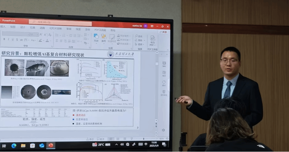 我院2021级博士生陈青青、王宇作为主讲人,分别以《融合数据驱动与量纲分析的混凝土/金属靶板侵彻行为研究》、《6061铝合金和SiCps/6061复合材料的率温相关力学行为研究》为题做了学术报告。张志斌以立足航空企业核心技术需求对课题进行了系统的点评,针对科研成果转化过程中的技术衔接、验证等环节,提出系统化改进建议;李世强和马胜国从学术研究出发,围绕课题的理论基础、研究方法与数据支撑,对课题内容的逻辑严密性与创新性进行深度剖析,并给出了完善研究的建议。