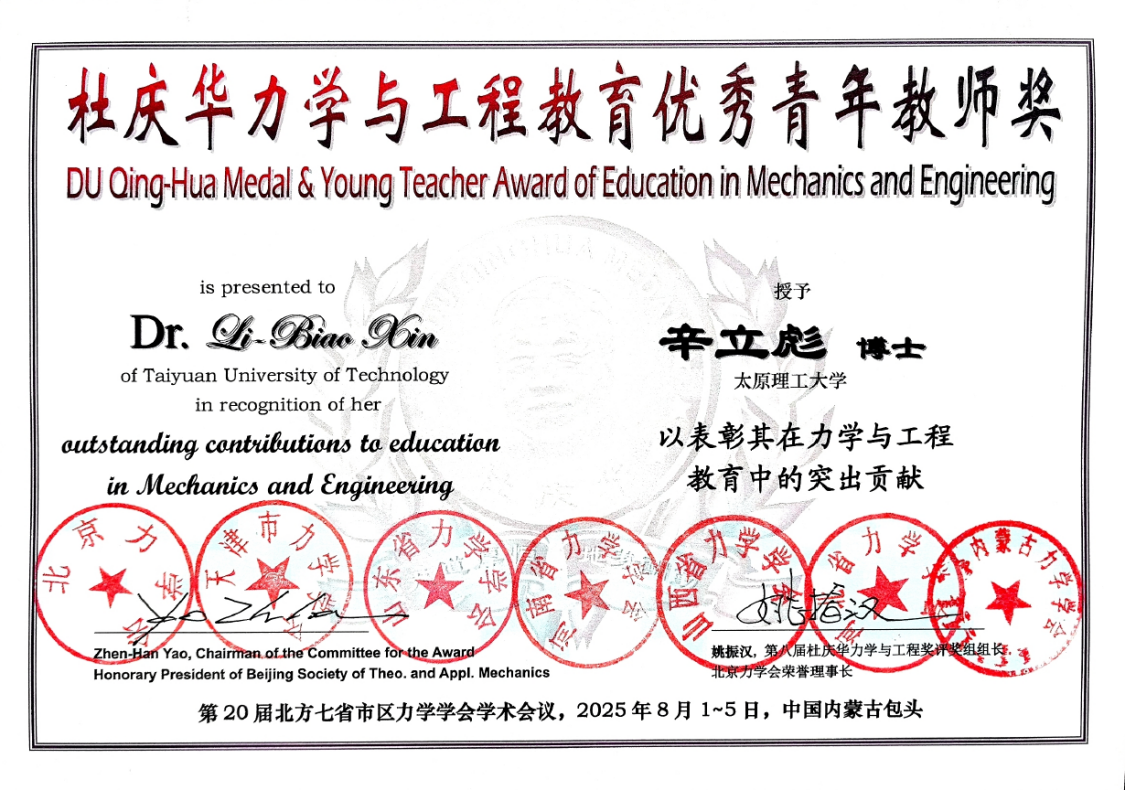 经北京力学会、天津市力学学会、山东省力学学会、河南省力学学会、山西省力学学会、河北省力学学会、内蒙古力学学会等北方七省、自治区、直辖市力学学会申请与推荐、专家评审和评奖小组投票,来自北京大学、天津大学等9个高校的9位教师获此殊荣,我院力工系教师辛立彪副教授荣获杜庆华力学与工程教育优秀青年教师奖。