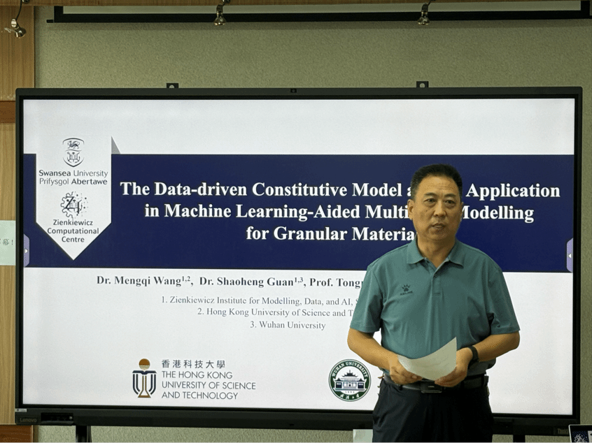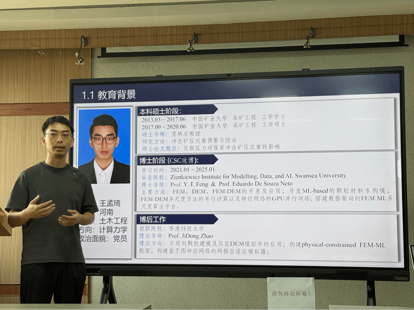 王孟琦博士以“The Data-driven Constitutive Model and its Application in Machine Learning-Aided Multiscale Modelling for Granular Materials”为题,系统介绍了其团队面向颗粒材料的多尺度计算力学最新成果。报告提出以机器学习应力-应变代理模型替代传统本构关系,显著降低耦合FEM-DEM模拟计算成本,为工程问题提供了高效数值工具。